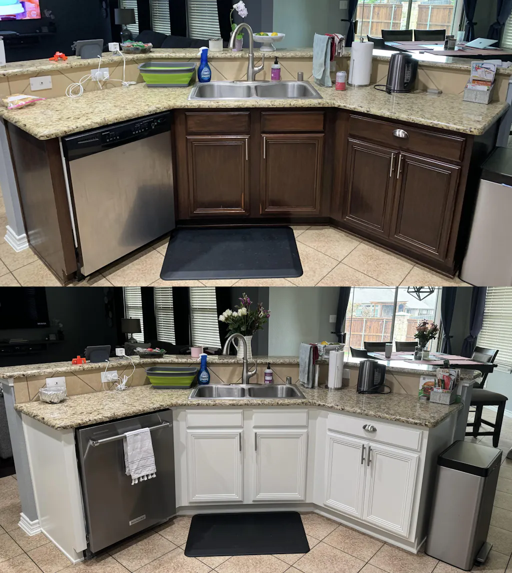 I followed Ryan's video on how to use the Flexio sprayer for kitchen cabinets and it worked like a charm. I had previously watched his videos on prepping your cabinets before painting which is just as important to getting a beautiful smooth finish. We used Sherwin Williams Emerald in Alabaster. Here are some before and after pictures.