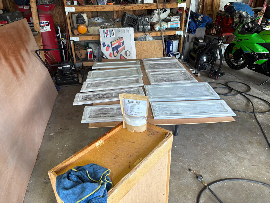 Cabinet Mud was easy to apply and sanded nicely to give me professional smooth looking doors and box faces. Mixed to a pancake batter consistency, used 1.5 small bags for a medium 22 door kitchen. Try to keep a minimal amount on inside corners/edges and it will save you on sanding time. This really is a great product and glad I used it on my project, check out the finish!